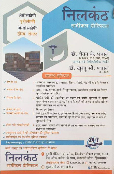 The administration process was smooth and the support staff was helpful, also, the best surgical doctor in Himatnagar, made a challenging time much more manageable. . I appreciate the emphasis on a holistic approach to health care. The best surgical hospital in Uttar GUJRAT, not only treated my symptoms but also focused on my overall well-being. The Nilkanth Hospital's dedication to innovation is evident.